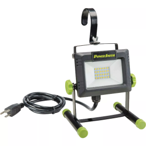 LED work light that is compact, versatile, and easy to use. It also delivers brilliant 5000K brightness. Use in the garage, attic, crawlspace, or while working on your boat, car, truck, or RV, or ATV. The light is all weather proof, and is equipped with a metal stand and 5-foot power cord. The base can also be maneuvered to provide a light that points upward for projects in your attic or as a safety light in the winter time. Includes LED light, metal stand, large metal adjustable hook, 5-foot power cord. 5-year warranty.