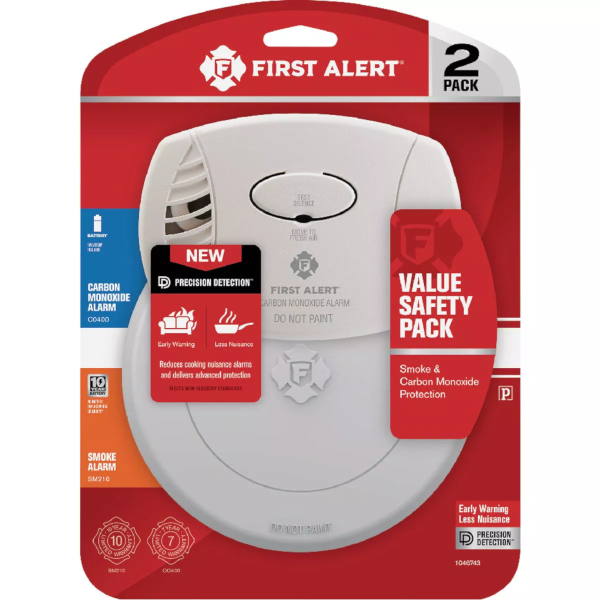 First Alert 10-Year Battery Photoelectric CO400 Carbon Monoxide and SM210 Smoke Alarm Value Pack. Provides protection against fire and carbon monoxide (CO). The SM210 Smoke Alarm features First Alert’s Precision Detection advanced sensing technology and meets the latest industry standards. The CO400 carbon monoxide alarm easily installs and provides reliable CO protection.
